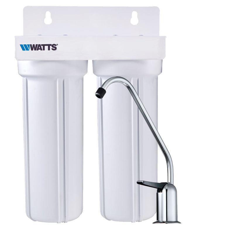 This two stage LCV under the counter water filtration system is great for homes with limited under the sink or under the counter space. A combination of one, five micron sediment filter and one, one micron carbon block lead reduction filter works great for removal of sediment, chlorine taste and odors, lead and cysts contaminants from the drinking water. The system is built on a heavy duty 10 gauge bracket pre-drilled with two mounting points giving the ability to either hang the unit or leave it standing on the filter bowl. A chrome faucet dispenser and tubing along with the installation kit is included. The unit measures 11 IN W x 14 1/2 IN H x 5 1/2 IN D and weighs approximately 10 pounds.