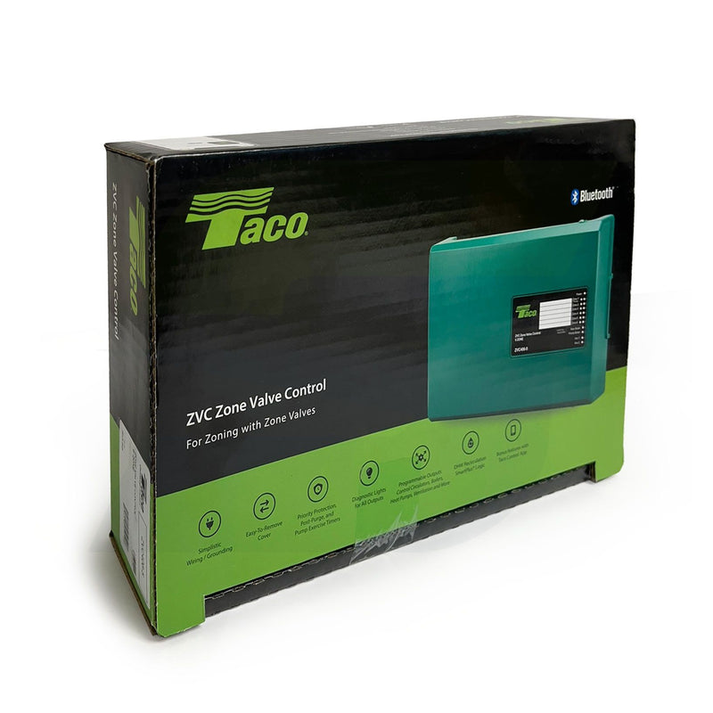 The Taco ZVC406-5 is a zone valve control panel designed for managing up to six zones in hydronic heating systems. It offers a priority function, typically used for domestic hot water, ensuring uninterrupted service when needed. With LED diagnostics, fuse protection, and simplified wiring for 2-, 3-, or 4-wire zone valves, the ZVC406-5 streamlines installation and troubleshooting. It’s expandable up to 120 zones and includes advanced features like post-purge, pump exercise, and Bluetooth-enabled configuration for easy setup and monitoring.