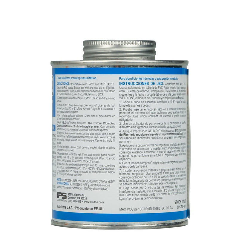 Tackle even the toughest, wettest plumbing conditions with Weld-On 735 Wet 'N Fast PVC Solvent Cement. Featuring an extremely fast set time, this PVC pipe cement excels in wet environments and in situations where quick pressurization is desired. It creates a deep fusion between pipes and fittings with interference fits up to 6 inches in diameter (and up to 4 inches for Schedule 80). It is suitable for all classes and schedules of rigid and flexible PVC, including foam core DWV (drain, waste, and vent). The unique Wet 'N Fast formula was designed specifically for plumbing systems but may also be used in irrigation, pool, spa, and other applications. The medium-bodied blue PVC cement applies smoothly and can be used without primer on non-pressure systems if local codes permit.