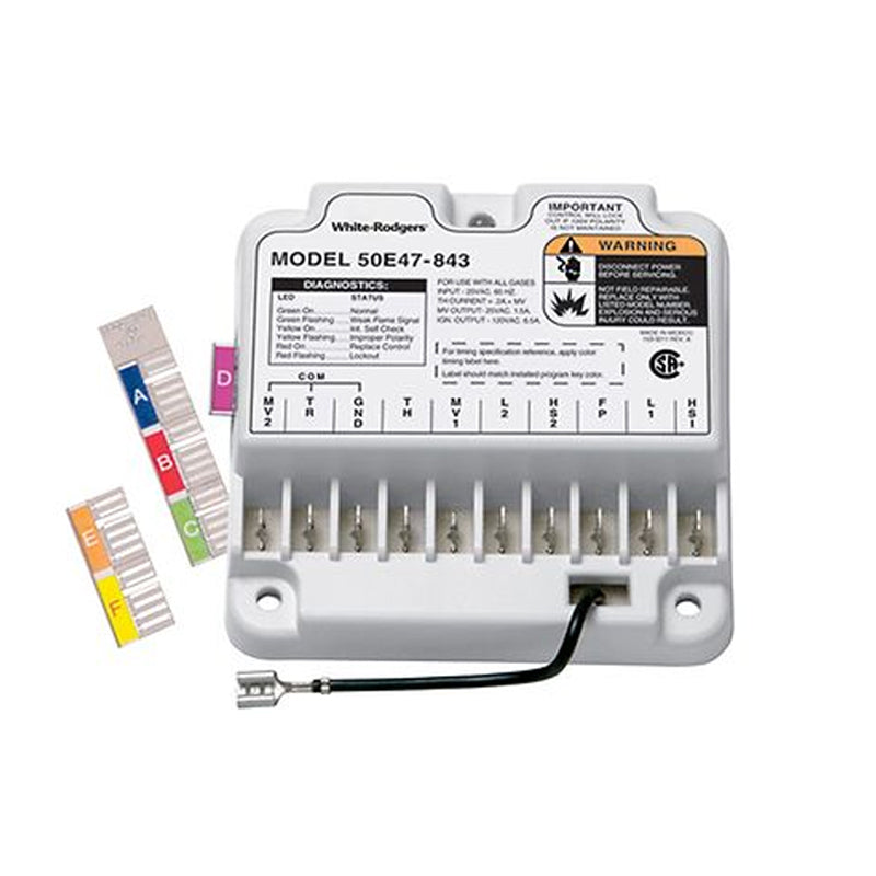Universal hot surface ignition module replaces all White-Rodgers 50E47-xxx modules and virtually all competitive silicon carbide, non-integrated modules. Includes everything needed for a fast replacement, including program keys to quickly customize the module to the furnace application.