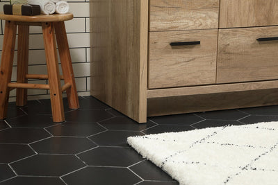 Modern sophistication is defined within the wood finish look and black barpulls of this vanity. Its length makes it the perfect addition to any sized home, and saves space with its storage area hidden behind the double cabinet doors and one bottom drawers. Topped with a highly durable thick resin white counter top and an integrated sink, this modern design will add everlasting class to your bathroom and powder room.
