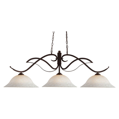 Bold flowing curves define this three light fixture. Finished in bronze, this fixture uses complimenting white mottle glass shades to create a contemporary, yet classic look. This fixture includes 72�� of chain on both sides to ensure a perfect hanging height.