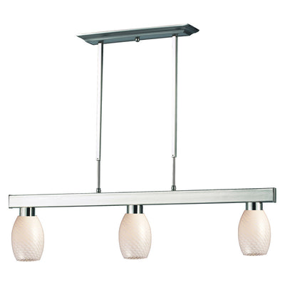 Straight line and rectangular detailing defines the bold and contemporary look of this three light fixture. Circular blue glass shades provide a splash of color, and telescoping rods ensure a perfect hanging height. This fixture would be the perfect addition to a kitchen, a game room, or anywhere else in the home.