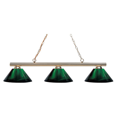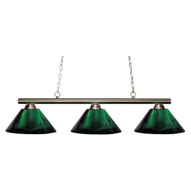 The simple styling of this three light fixture creates a classic statement. Finished in brushed nickel, this three light fixture uses green acrylic shades to compliment its classic look, and 36�� of chain per side is included to ensure the perfect hanging height.