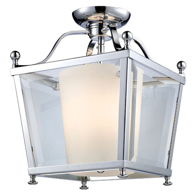 Worlds collide when modern styling fuses with traditional warmth to create an efficiently constructed ceiling fixture. Chrome geometric shapes and clear beveled glass create clean look, while the matte opal glass inside the fixture will be sure to give any room a warm, inviting light.