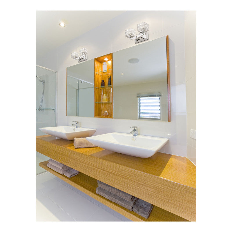 Shiny chrome brings a fresh finish to the classic design of this chrome steel two-light vanity light. With crystal-cut clear glass shades, it brightens and energizes a contemporary space.