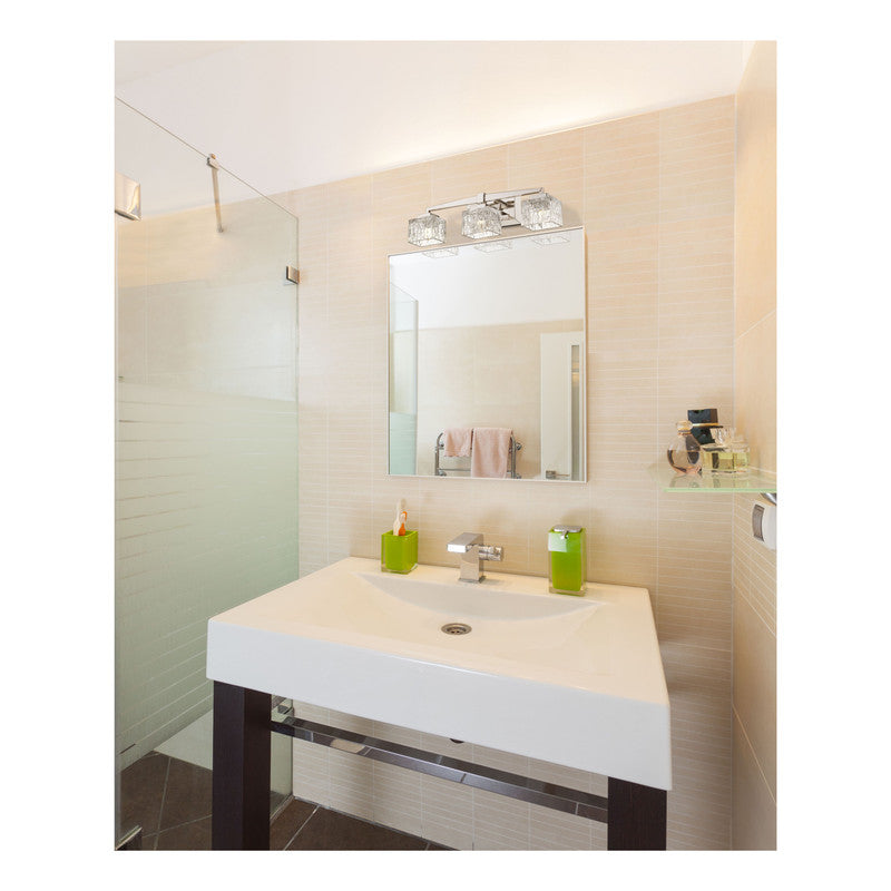 Add an interesting twist to contemporary bathroom d�cor. With crystal cut clear glass shades and a shiny chrome finish, this steel three-light vanity light nicely frames a modern bathroom sink.