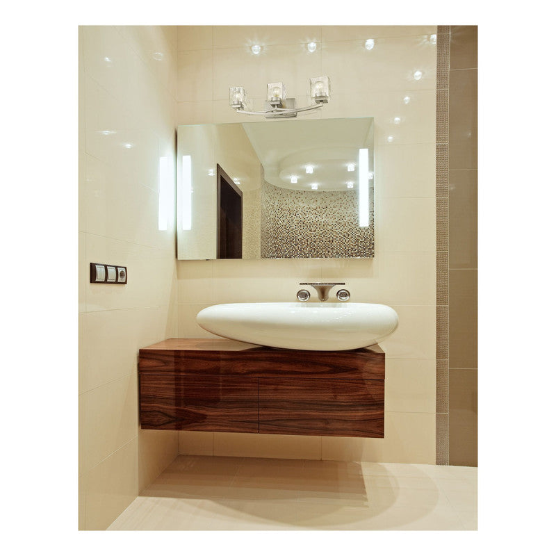 The Zaid collection of contemporary bath fixtures are defined by the gentle curve of the fixture arm paired with the finely variegated detail of the Clear glass shades. These contemporary fixtures are offered in many sizes and a choice finishes which include Bronze, Brushed Nickel, or Chrome.