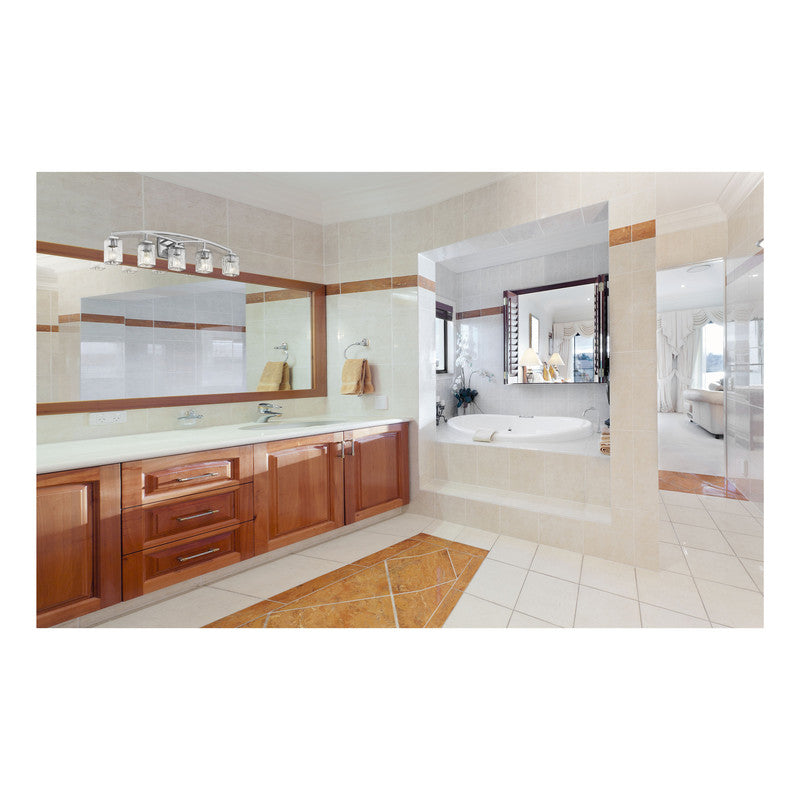 With a gorgeous brushed nickel finish, this five-light vanity light offers expansive reach and a sophisticated design. Enjoy the textured look of boxy chiseled clear glass shades as they affix to a charming steel frame with gentle curves and straight lines.