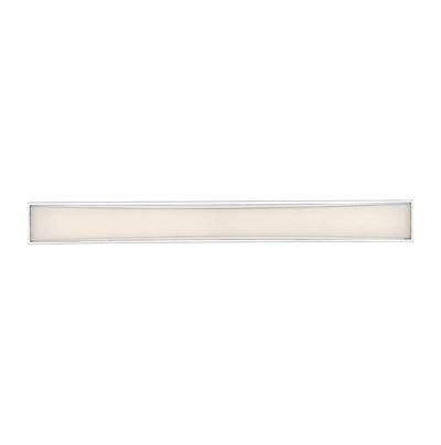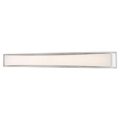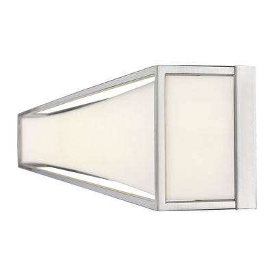 Clean and modern, this two-light vanity light showcases sleek, gleaming lines of brushed nickel finish metal. Perfect for a powder room, it boasts a delicate, frosted white shade that diffuses the light into a soft, graceful glow.
