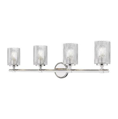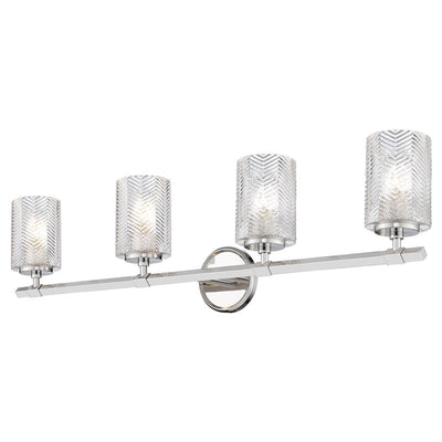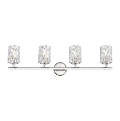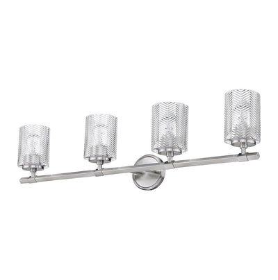Place this brushed nickel vanity light over a bathroom mirror to add a soft, flattering glow to your daily routine. This elegant fixture flaunts four clear glass shades adorned with decorative etchings for a dazzling display of light.