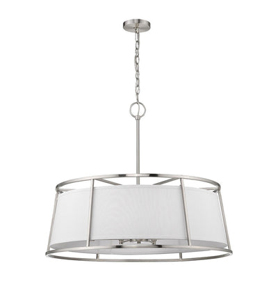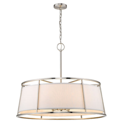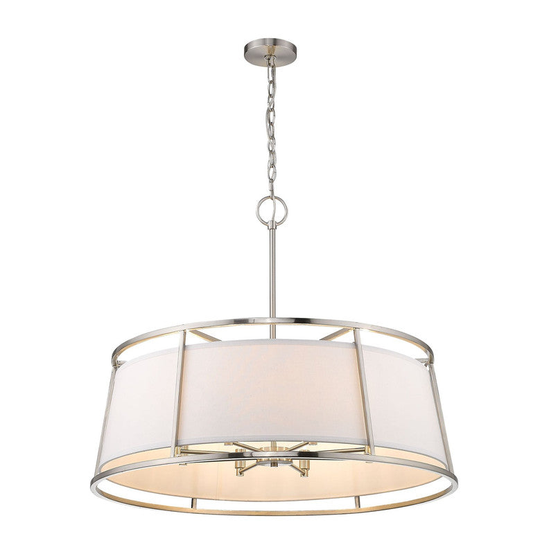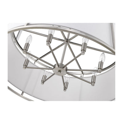 Illuminate your living space with the alluring glow of this elegant, eight-light pendant. With a versatile design that works well in almost any room, this sophisticated fixture blends a brushed nickel frame with a soft, white shade for beautiful ambiance.