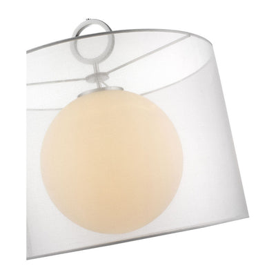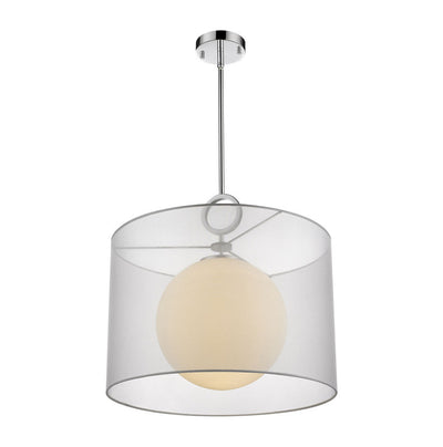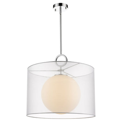 Our modern take on a mid-century inspired pendant, features both a polished chrome, oversized bracelet finial and an oversized white opal globe which appears to float inside the shade of this pendant. Available in two sizes with three shade colors of black, gray or white.