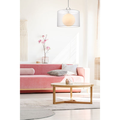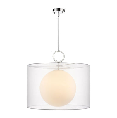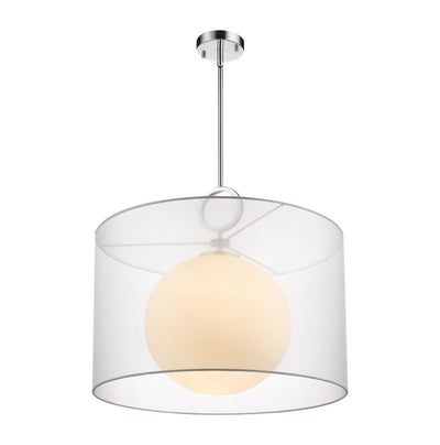 Our modern take on a mid-century inspired pendant, features both a polished chrome, oversized bracelet finial and an oversized white opal globe which appears to float inside the shade of this pendant. Available in two sizes with three shade colors of black, gray or white.