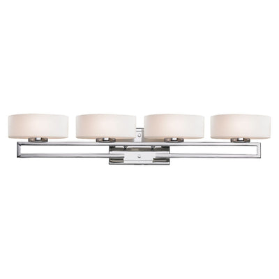 This set of four vanity lights sits on a cut-away rail finished in chrome, with curved matte opal glass for a dazzling modern design.