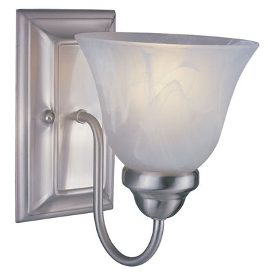 Simply elegant is the best way to describe this wall sconce/ one light vanity which features a detailed wall mount finished in brushed nickel and complimented with a white swirl glass shade.