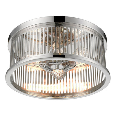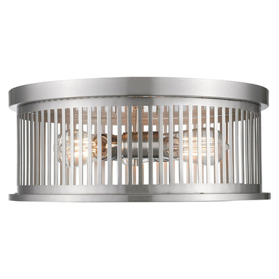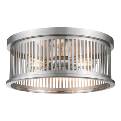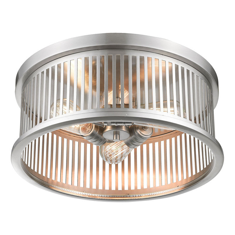 A trio of vintage bulbs nestle in a linear-inspired steel housing that makes up this exceptional fixture. Offering a decidedly industrial attitude, this three-light brushed nickel finish round flush mount ceiling fixture delivers a charming look.
