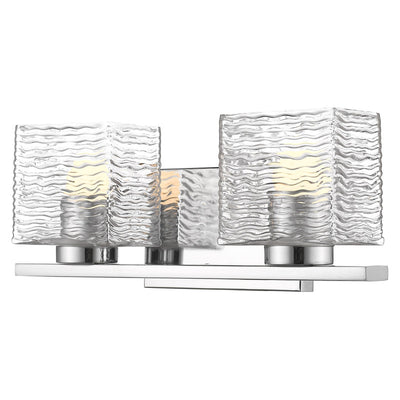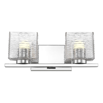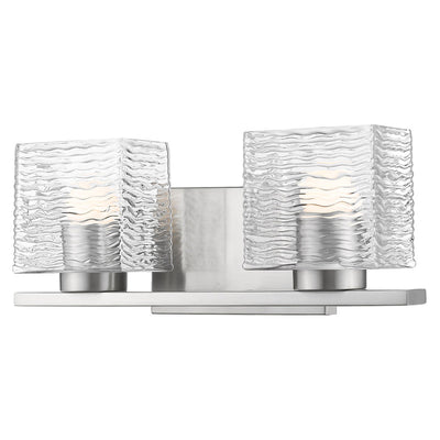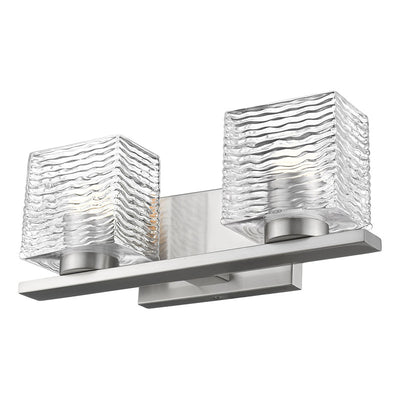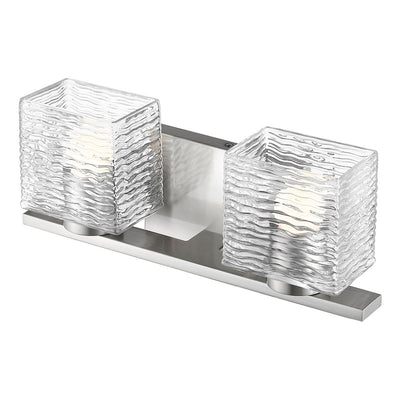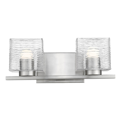 An easy elegance and beautiful brushed nickel mount lighten the atmosphere of a master or guest bath with this two-light LED-integrated vanity fixture. Indulge in a love of texture with a pair of rippled clear glass shades that accentuate a character-rich contemporary space.