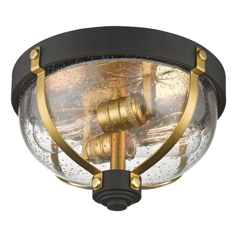 A design-forward blend of historical and contemporary creates a visually pleasing effect in this two-light flushmount ceiling fixture. Bronze and brass steel combine in a stylish frame housing a seedy glass shade, delivering a versatile look that spans a host of design motifs.
