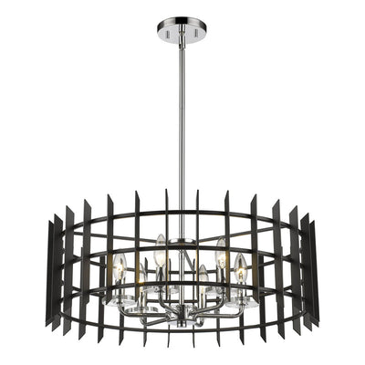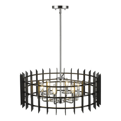 The dynamic pairing of chrome and matte black steel lend a fresh ambiance to this contemporary six-light pendant. Modern styling receives a bit of historical industrial attitude with its wrought-iron inspired character and candelabra-style bulb mounts.