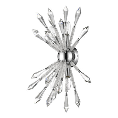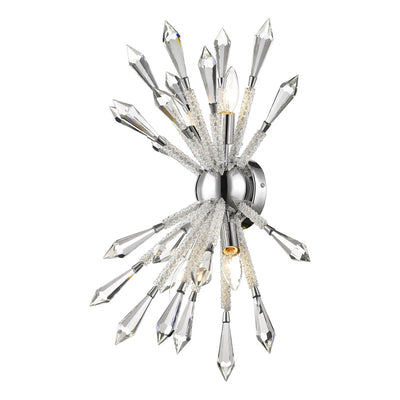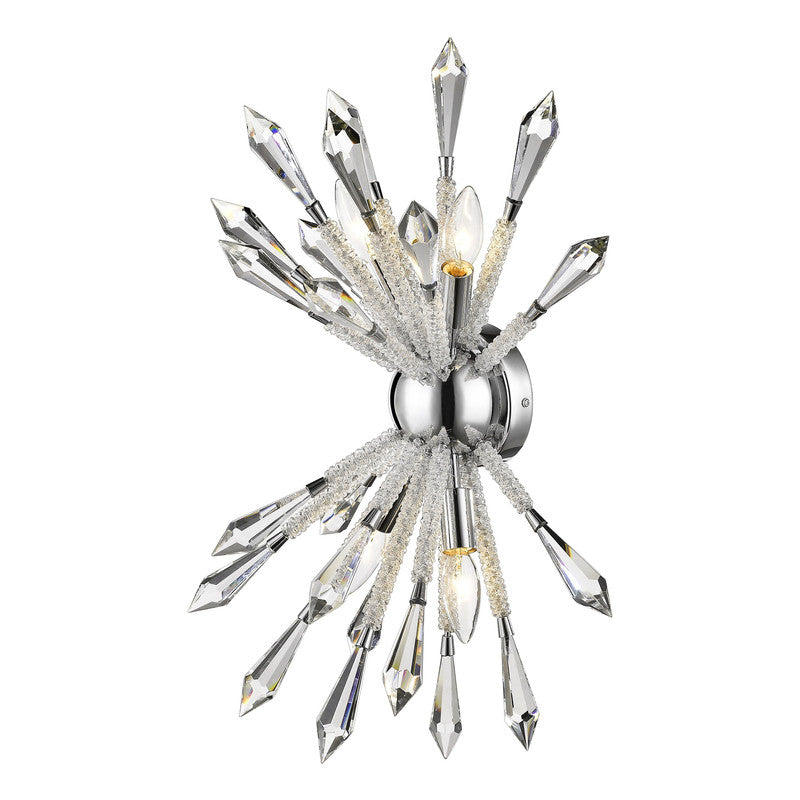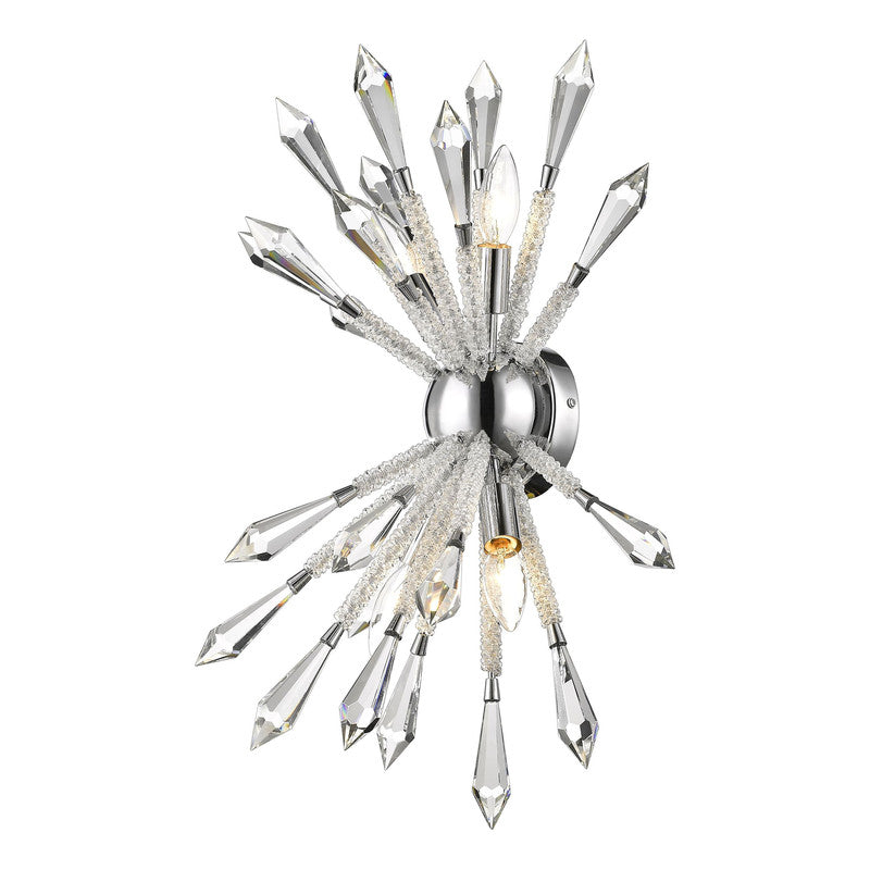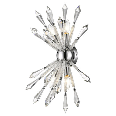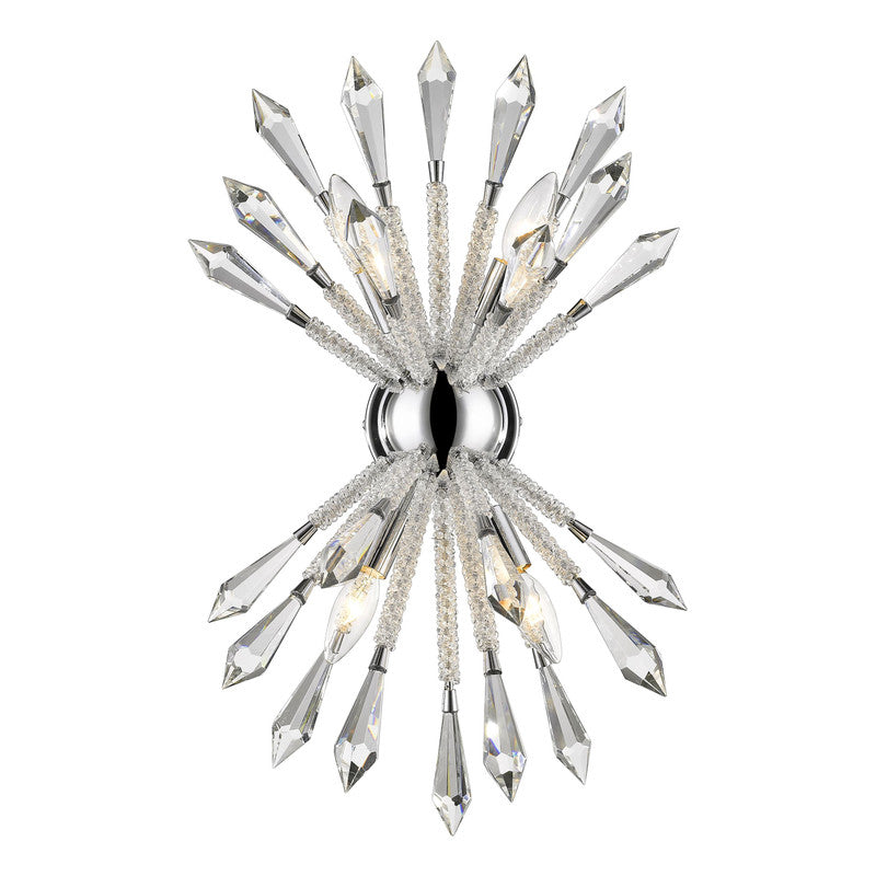 The most fashionable decor schemes embrace out-of-the-box designs, and this crystal and iron four-light wall sconce masters a fresh, stylish ambiance. Emulating an explosive display, its chrome finish trim and wall mount lends a perfect complement to elegant crystal stems.