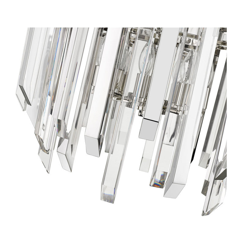 Chunky, rectangular slabs of crystal towers, suspended between highly polished stainless-steel towers, formed together in contemporary sleek shapes, create a stunning collecti on of crystal chandeliers and pendants.