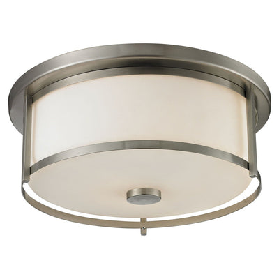 The contemporary Savannah family adds sophistication to home d�cor. The beautifully appointed brushed nickel fixture is perfectly paired with matte opal glass shades in this 3 light flush mount.