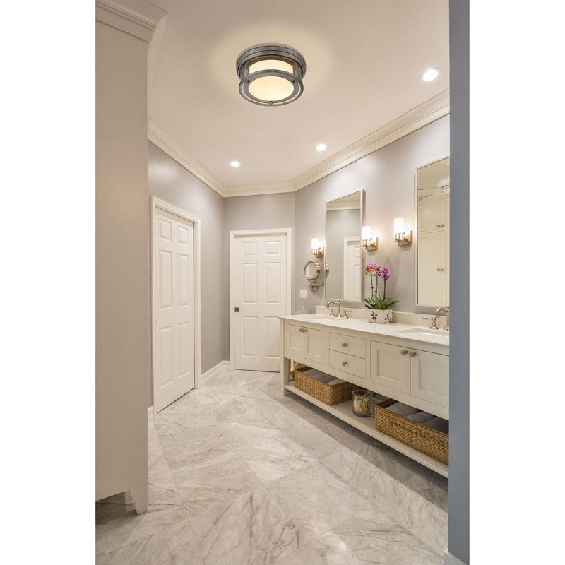 Give your dining room or bedroom a chic, sophisticated update. This beautiful, brushed nickel flush mount ceiling fixture features two glowing bulbs beneath a delicate, glass shade that's white on the inside and clear on the outside. An exquisite lighting option to highlight your refined sense of style.