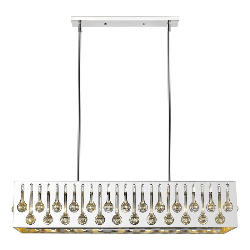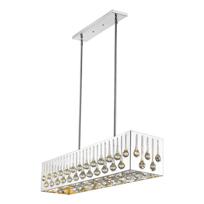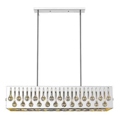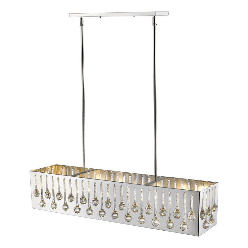 Marvel in the artistry of this exquisitely designed chrome and crystal island/billiards light. Remarkable detailing blends slender droplets of crystal over a sleek horizontal chrome finish steel frame that houses seven radiant lights.