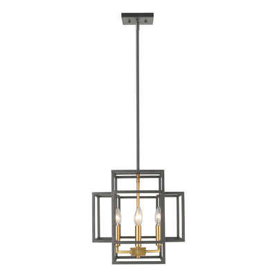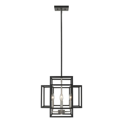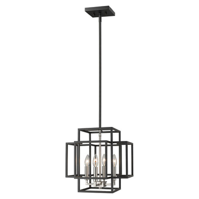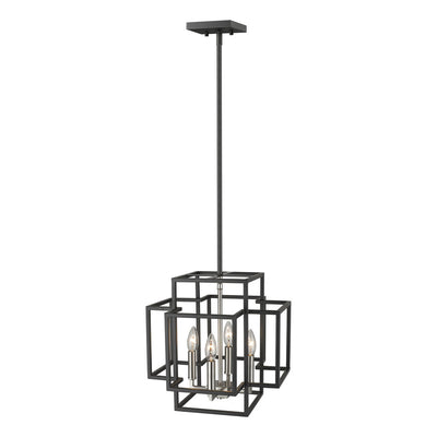 Modern and metropolitan in style, this black and brushed nickel steel four-light pendant�s softening features render a splendid d�cor element perfect for transitional spaces. An eye-catching open boxy frame reveals romantic candelabra-style bulb bases in a sleek brushed nickel finish, creating a captivating contrast and a stylish fixture to highlight a dining ensemble or entryway.