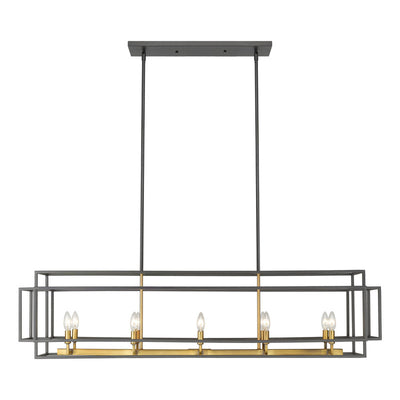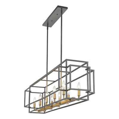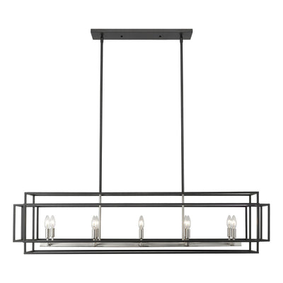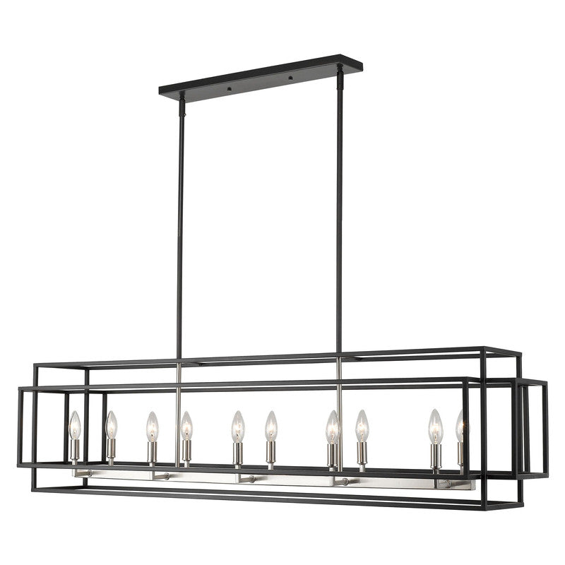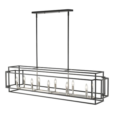 Bring a crisp modern look with softening effects, and choose this black and brushed nickel finish 10-light island pendant for a contemporary space. An eye-catching rectangular shape makes it a perfect fixture for illuminating a kitchen island or billiards space, and the architectural effect of an open-concept boxy steel frame highlights the delightfully traditional feel of candelabra-style bulb bases.