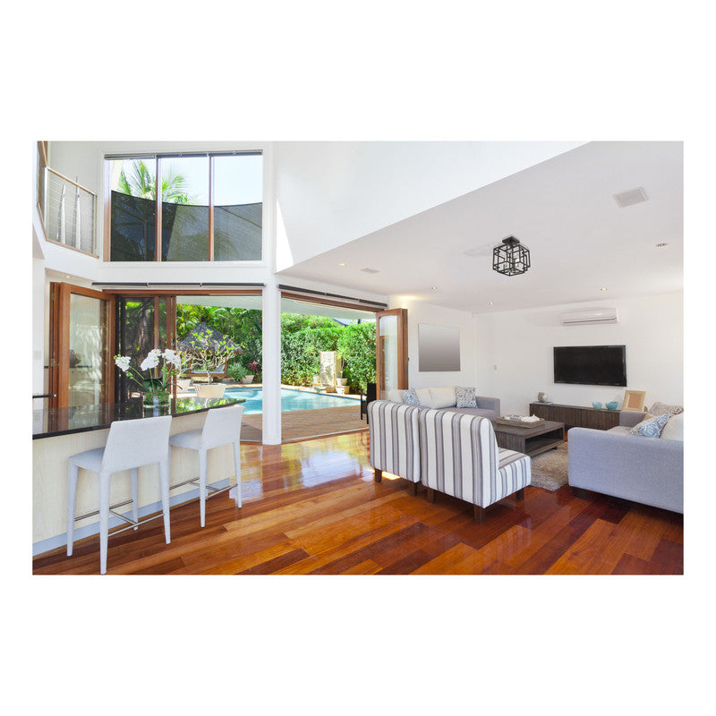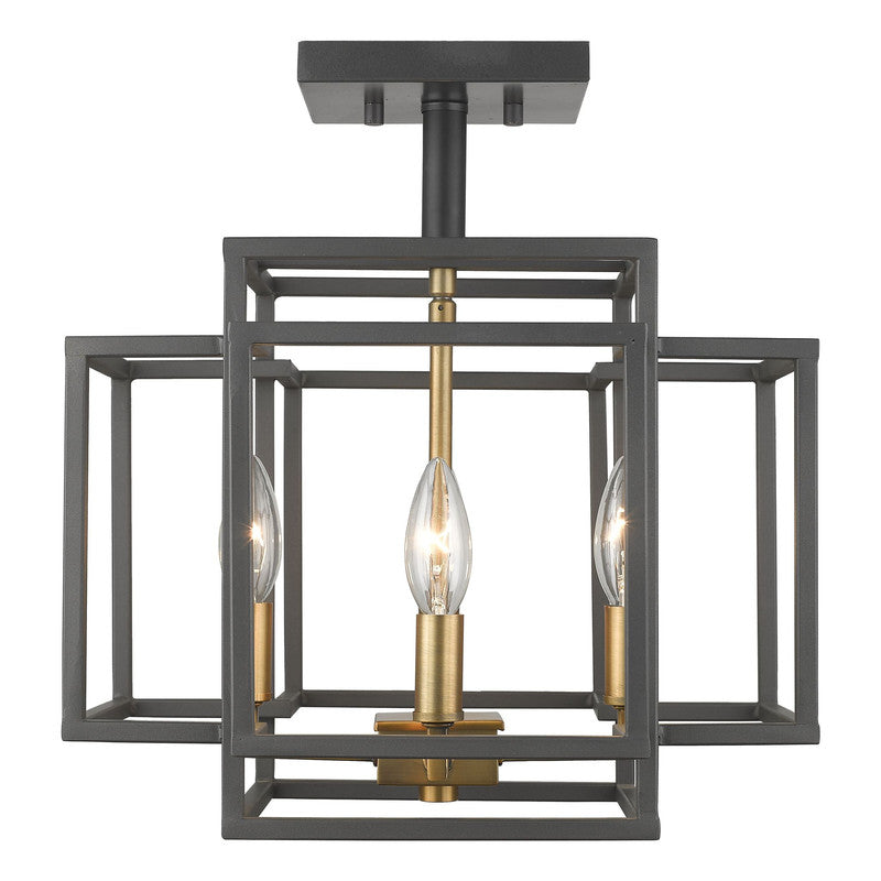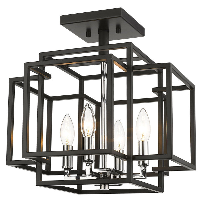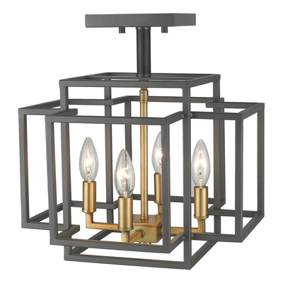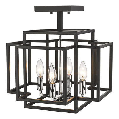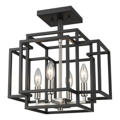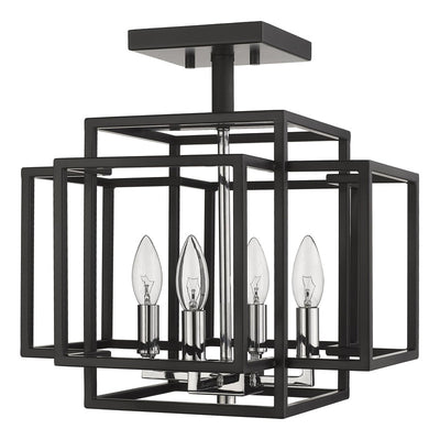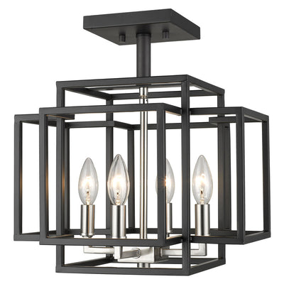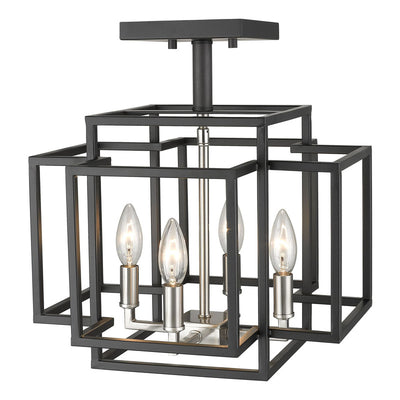 Blessed with dimensional flavor and industrial-inspired character, this four-light semi-flushmount ceiling light offers ambient lighting in a space with moderately low ceilings. Revel in a boxy, open-concept frame crafted from black finish steel, and note the charming look of brushed nickel finish candelabra-style bulb bases that round out its versatile aesthetic.