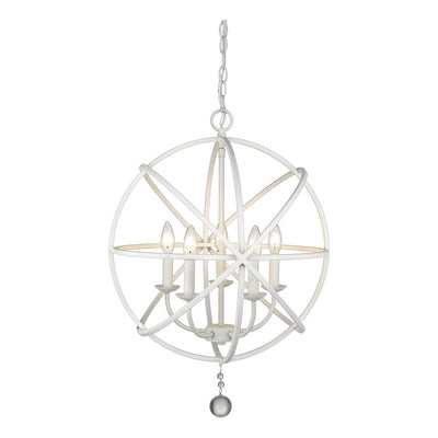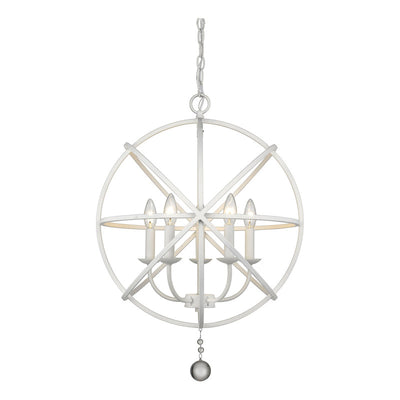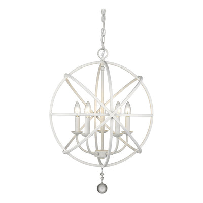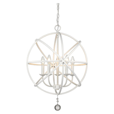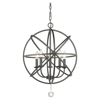 Fun contemporary style with a space-age twist adds character to this matte black orb-shaped five-light chandelier. Custom finish options allow a perfect palette that complements your d�cor personality, and a charming strand of dangling crystal balls changes up its rugged personality.
