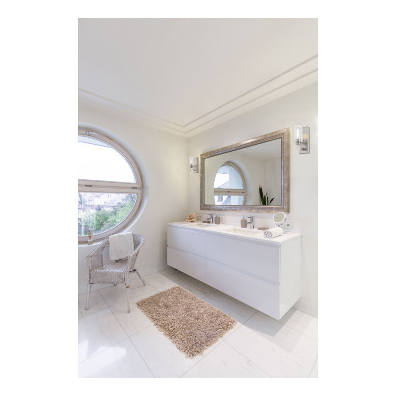 Visionary modern art touches give this mid-century modern one-light wall sconce a chic beauty. A lustrous brushed nickel finish highlights the gleaming radiance of the clear glass cylinder shade.