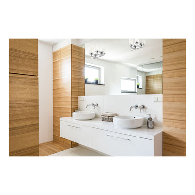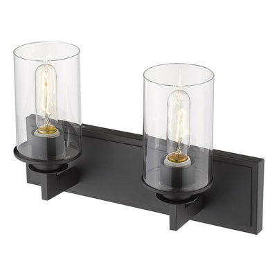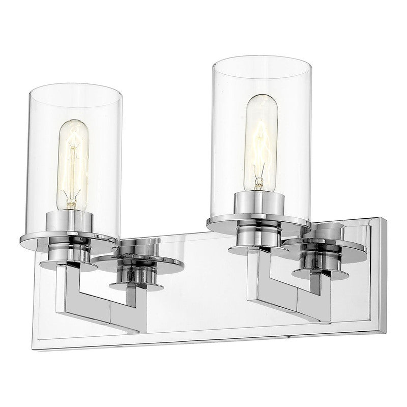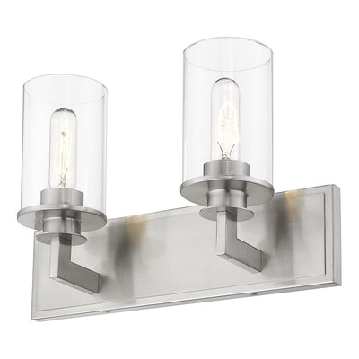 This mid-century modern two-light vanity exudes an elegant sophistication. A lux brushed nickel finish gleams against the brilliance of the clear glass cylinder shades.