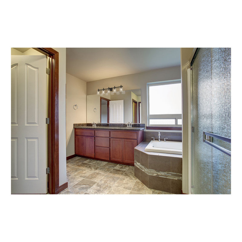 A master en suite gains exceptional elegance with this brushed nickel five-light vanity light. Enjoy the artistic and architectural design of a stunning fixture with clear seedy glass shades, offering a perfect fit to both contemporary and transitional decor schemes.