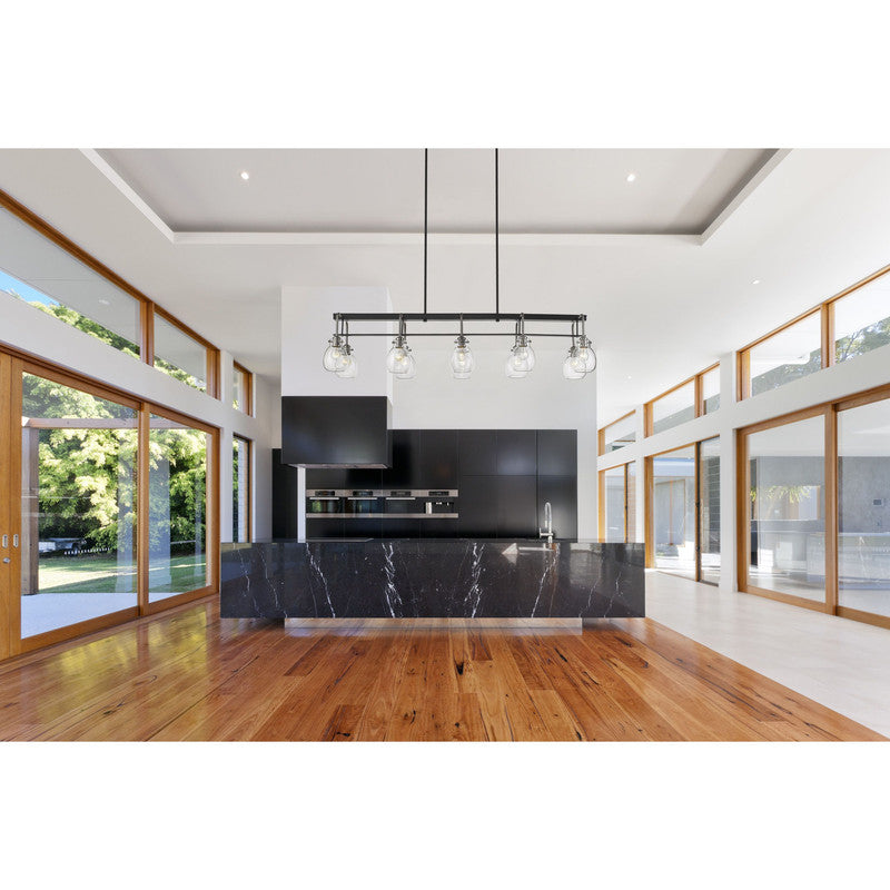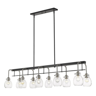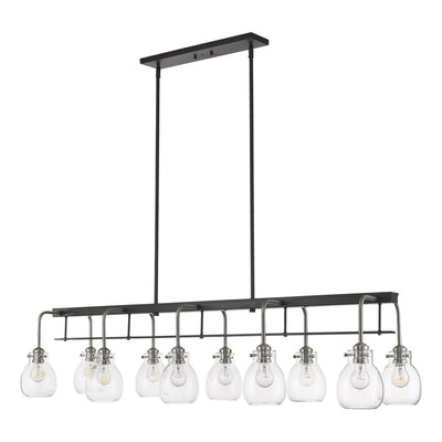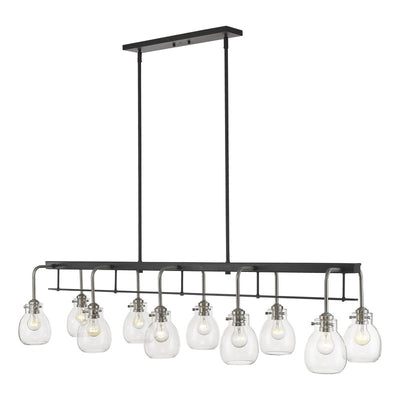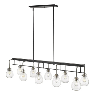 A dual-tone finish changes up the personality of this dynamic ten-light island chandelier. Soak up the charm in an industrial-themed design with a linear frame in matte black and brushed nickel, and clear glass shades that offer a slightly fragile feel.