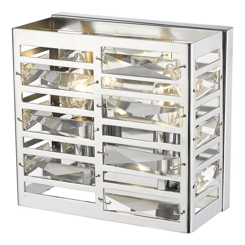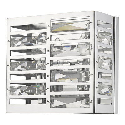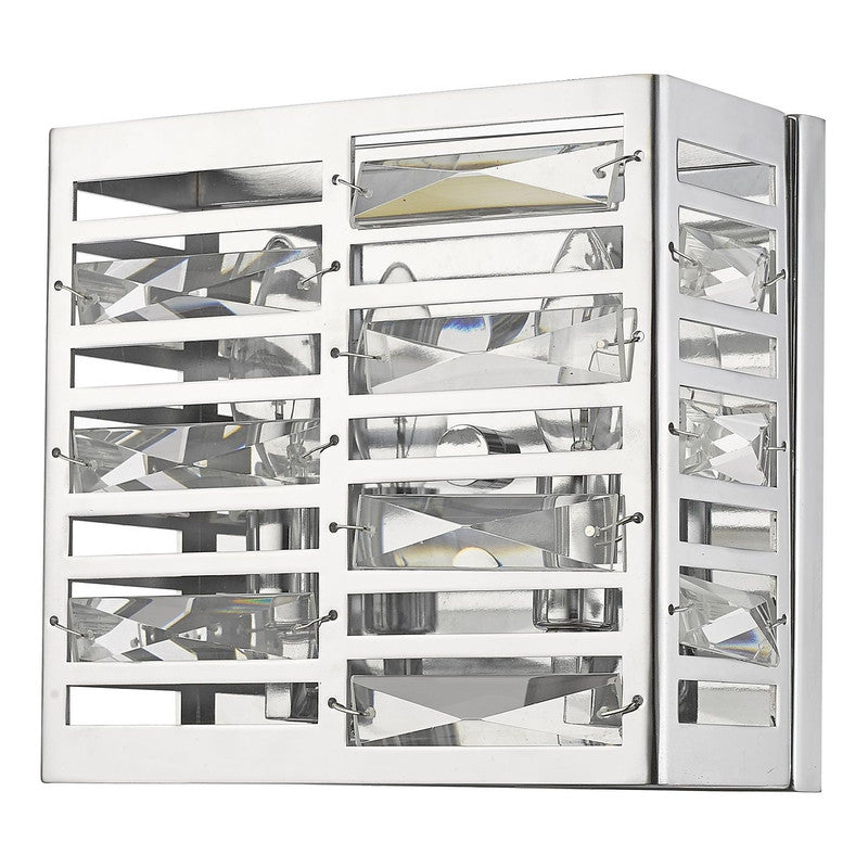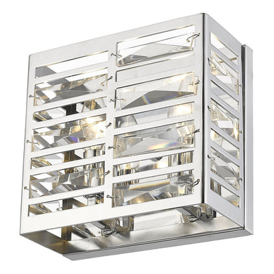 Clean lines from the square silhouette of this two-light wall sconce look stunning when paired with a modern motif. Geometric cut out shapes elevate the beaming chrome finish.