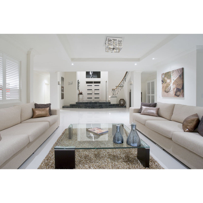 Lustrous crystal layering give the Cronise collection its unique style. Round and square frames finished in Chrome encase the beautiful crystal, produce a sparkling light.