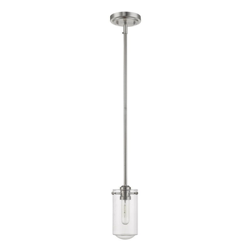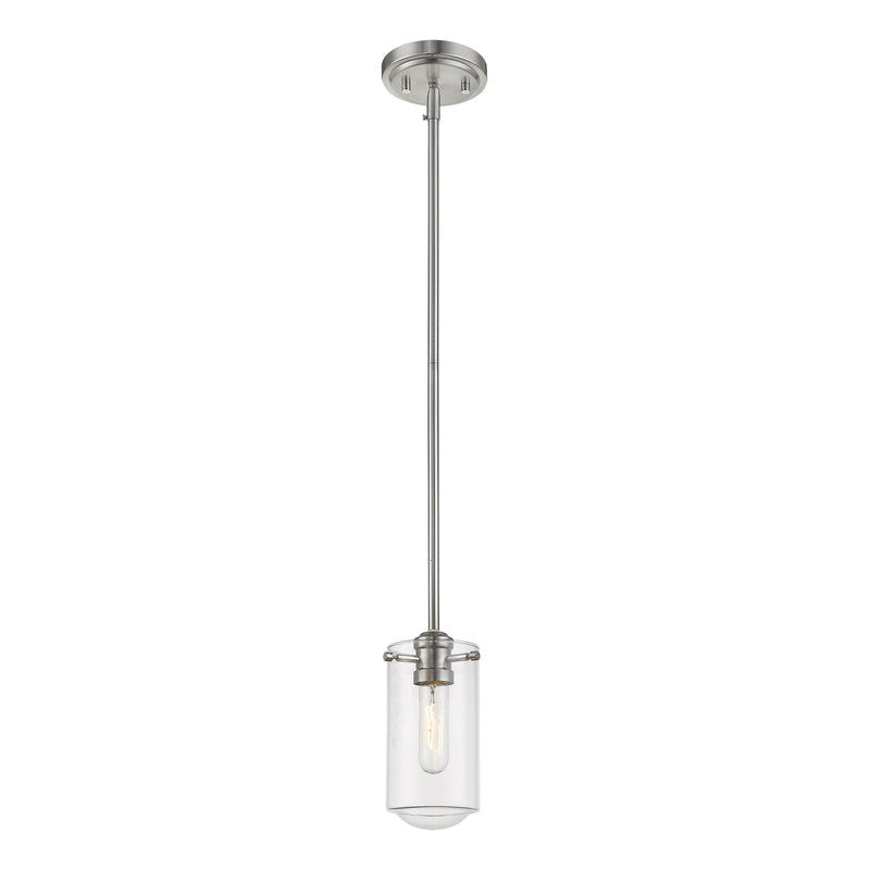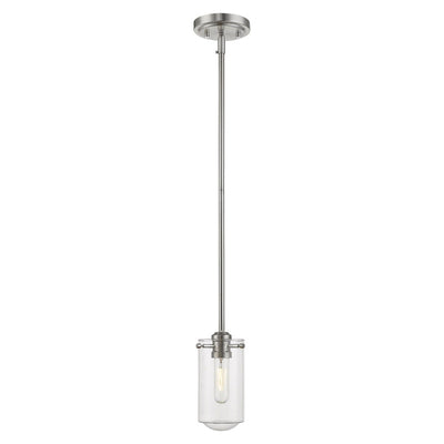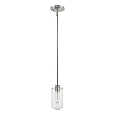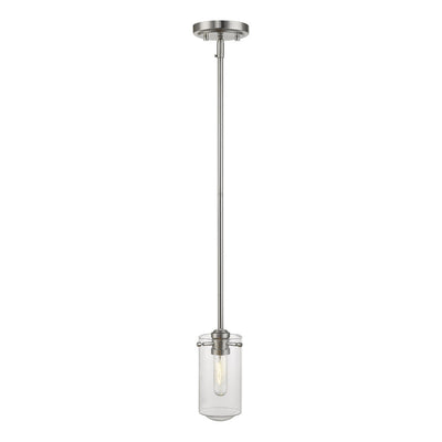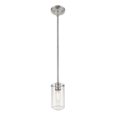 Clean lines and radiant metallic shine set this one-light pendant light apart from the others. Bright and modern, the elongated frame boasts a brushed nickel finish, streamlined with a clear glass shade.
