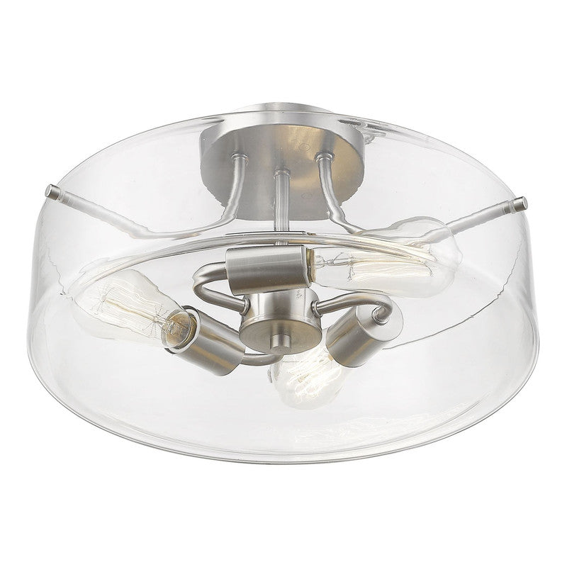 Clean curves and a clear glass shade make this three-light flushmount ceiling light a radiant focal point. Sleek brushed nickel shines brilliantly against any modern motif.