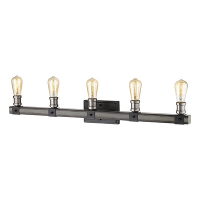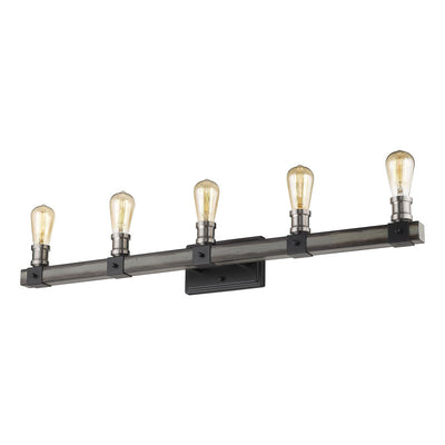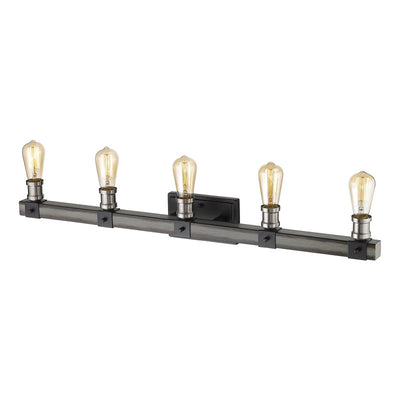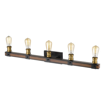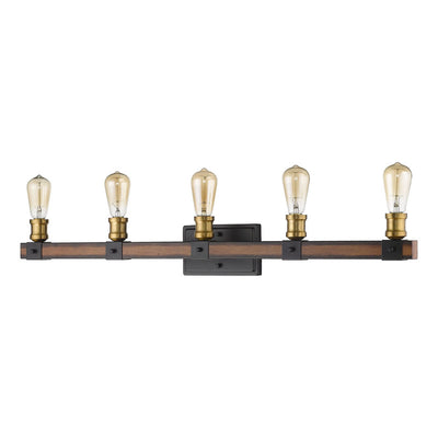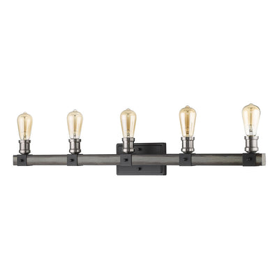 Featuring a sleek silhouette, this five-light wall sconce looks great above any bathroom vanity. The faux barnwood construction showcases an ashen hue, modernized with exposed lightbulbs for an industrial feel.