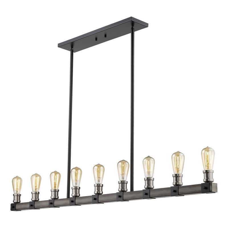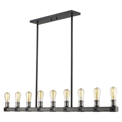 Shine brilliance in a kitchen or dining room with the elongated shape of this nine-light pendant light. The sleek silhouette showcases faux barnwood and barnboard in a distressed ashen hue, complete with industrial exposed lightbulbs.