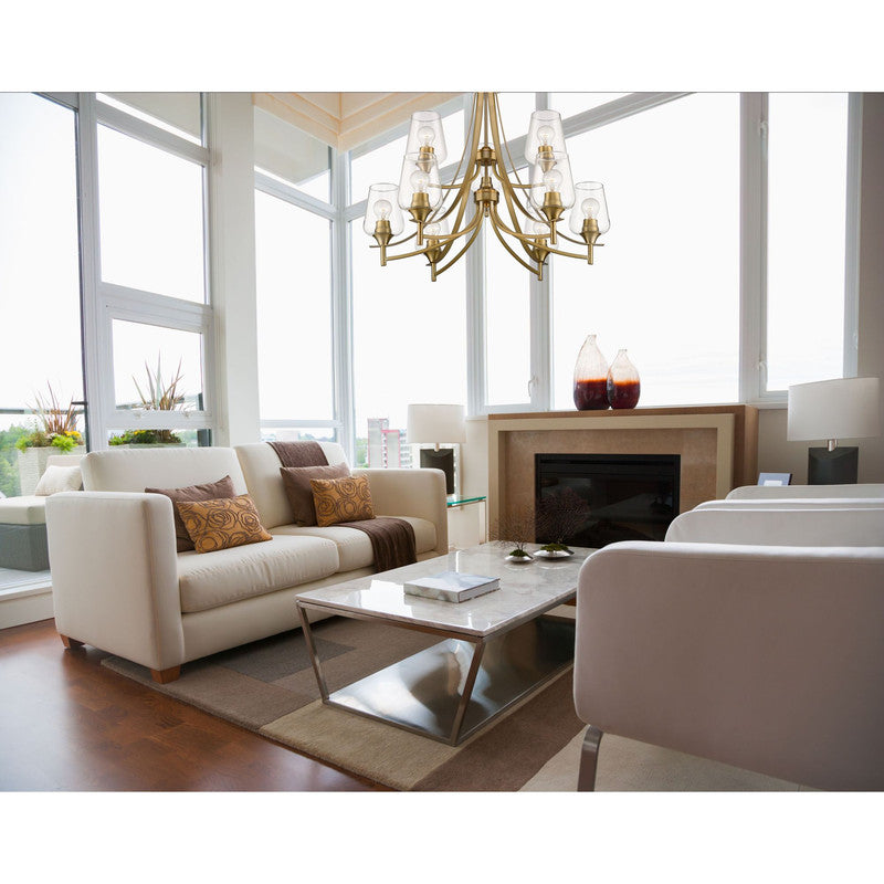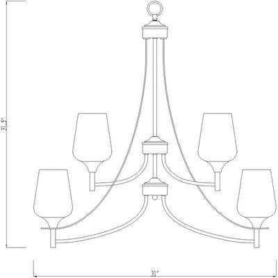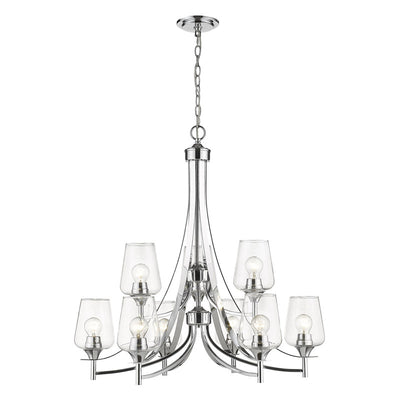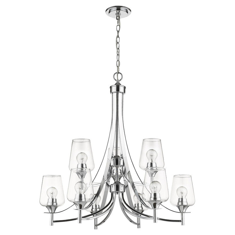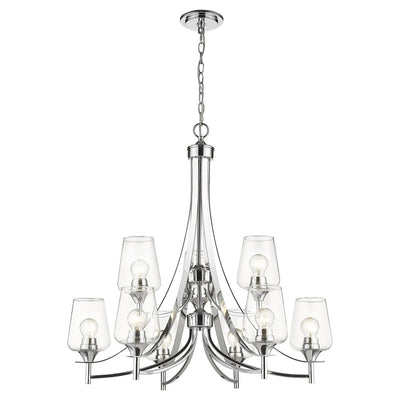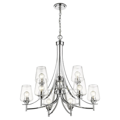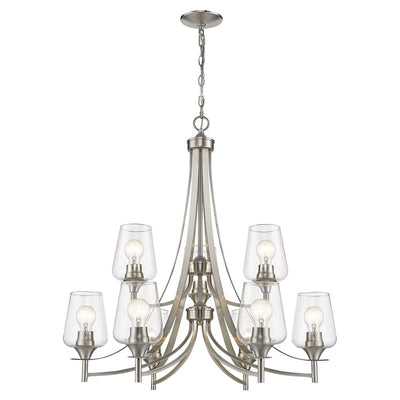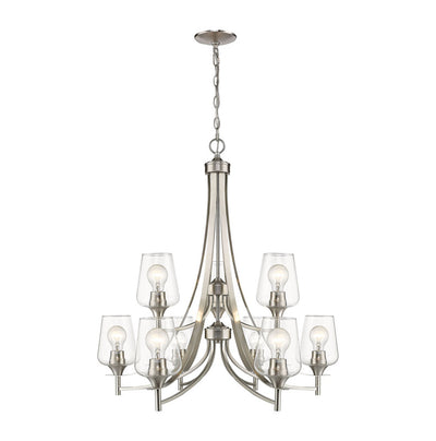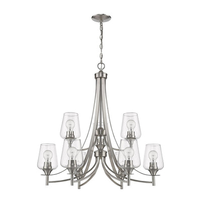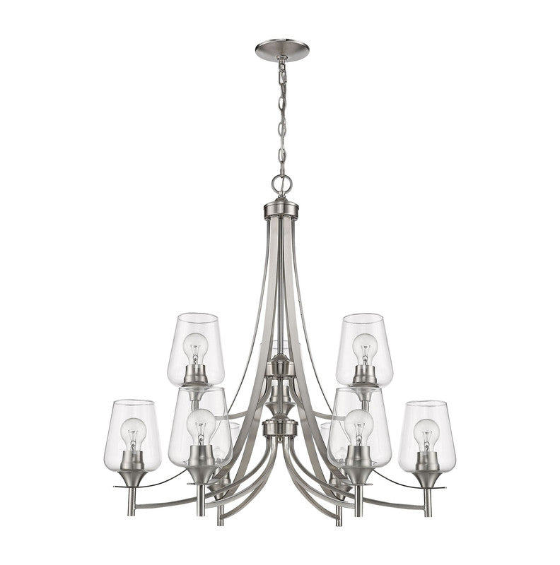 Designed with sleek metal lines and an elegant silhouette, this brushed nickel chandelier is a stunning home decor upgrade. This nine-light fixture features clear glass shades for a magnificent display of light.
