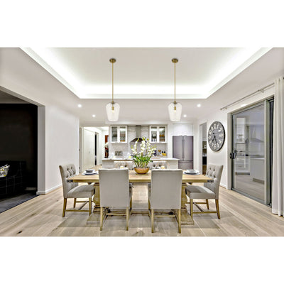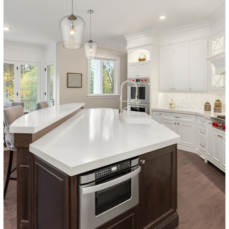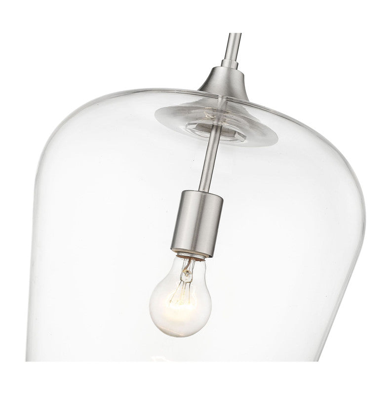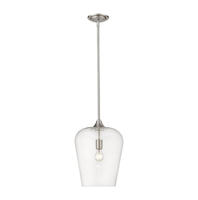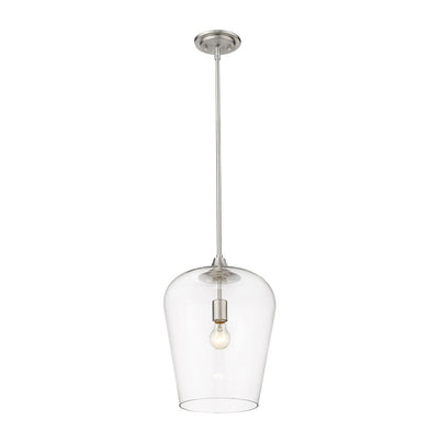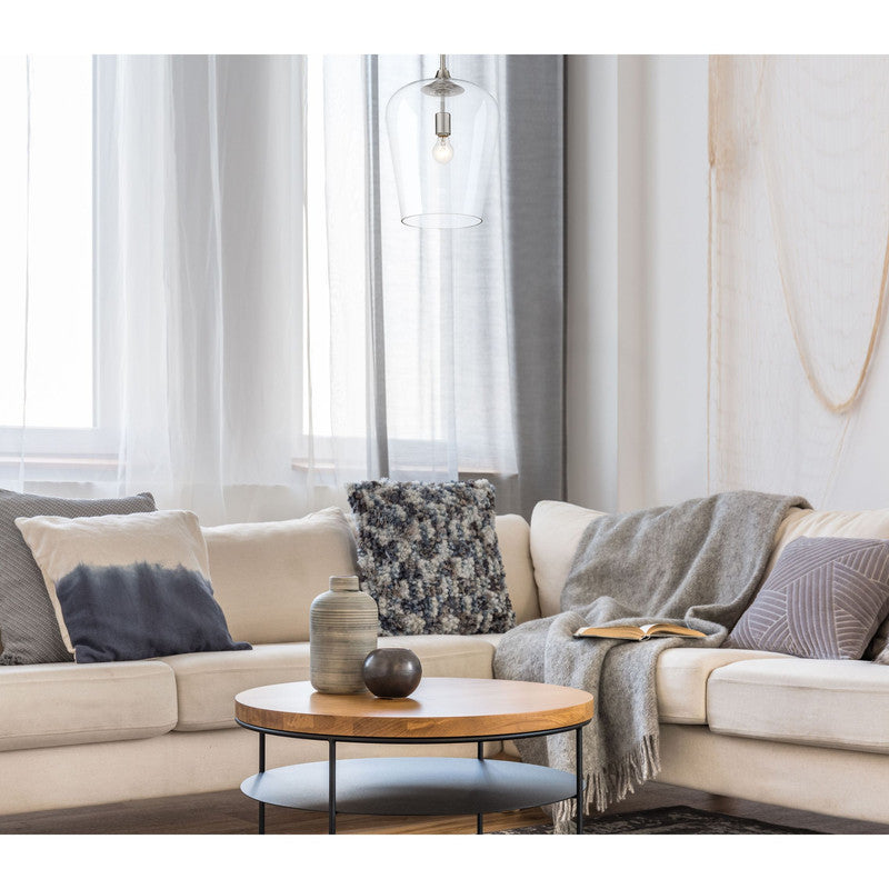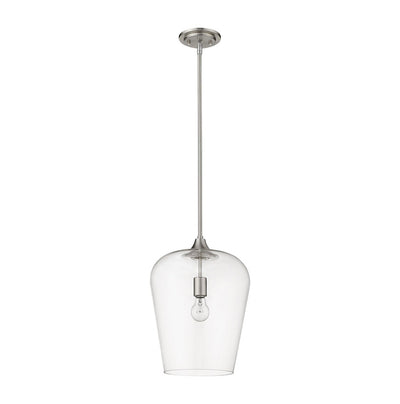 Designed with sleek metal lines and an elegant silhouette, this brushed nickel pendant is a stunning home decor upgrade. This single-light fixture features a clear glass shade for a magnificent display of light.