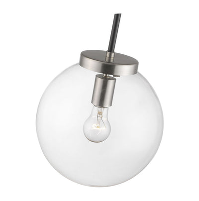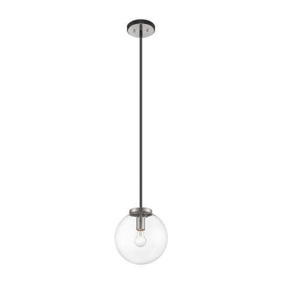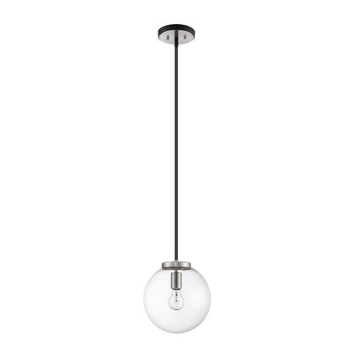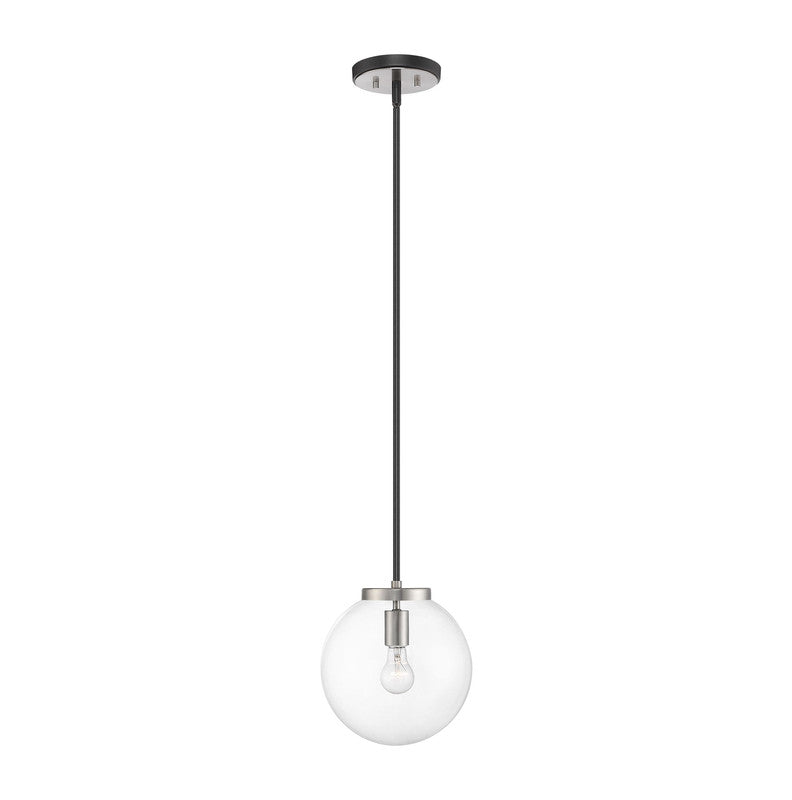 Clean, crisp lines and a slender design are the hallmarks of this one-light pendant for your home. It's fashioned with a matte black and brushed nickel finish and a round clear glass shade for the radiance you're looking for. This elegant light is perfect for the dining room, foyer, bedroom, or home office.