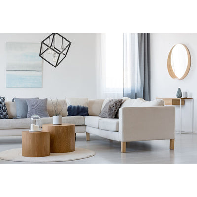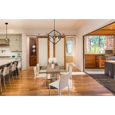 Bold and artistic, the Vertical Pendant makes a striking focal point in any modern or eclectic space. A series of steel, open-framed cubes are suspended at various lengths from braded black cords. Available in several eye-catching options. Finishes include black frame with brass accent, or black frame with brushed nickel accent.