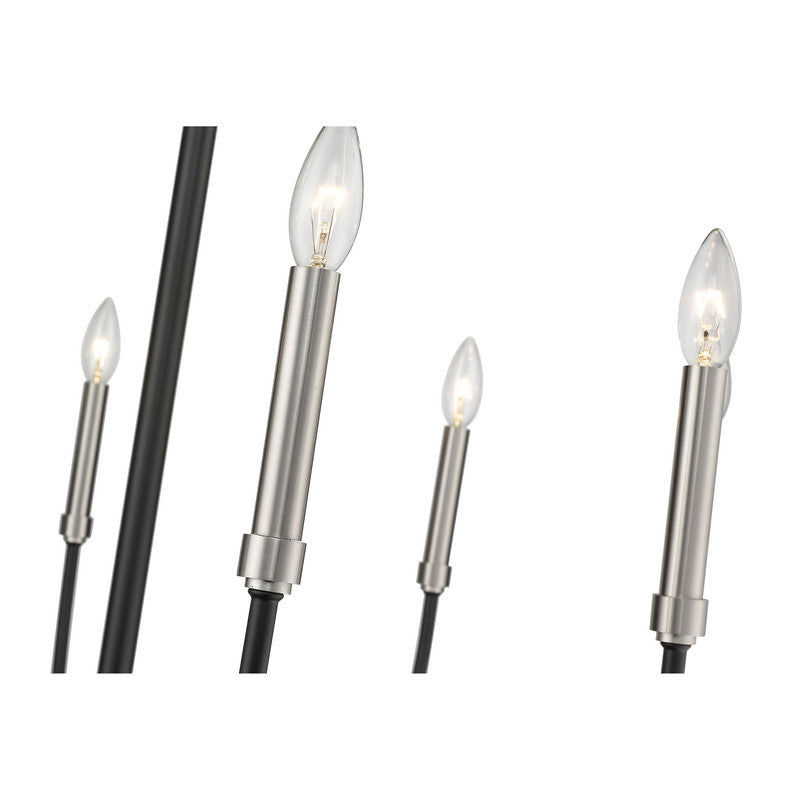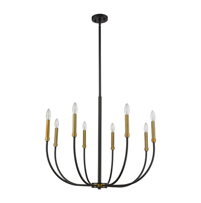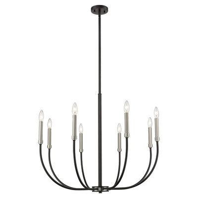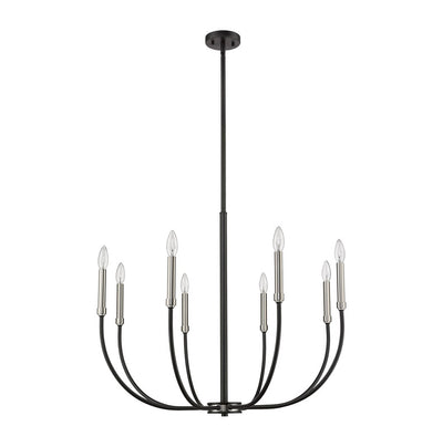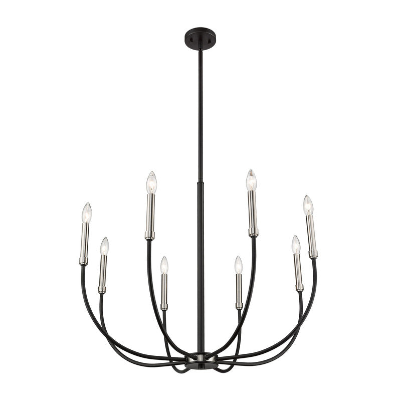 Shapely contours highlight the appeal of this two-tone eight-light chandelier. The candelabra-type design features a classic matte black and brushed nickel finish for an elegant touch. This alluring chandelier will add a discernible charm to any dining room, foyer, kitchen, or entertainment room.