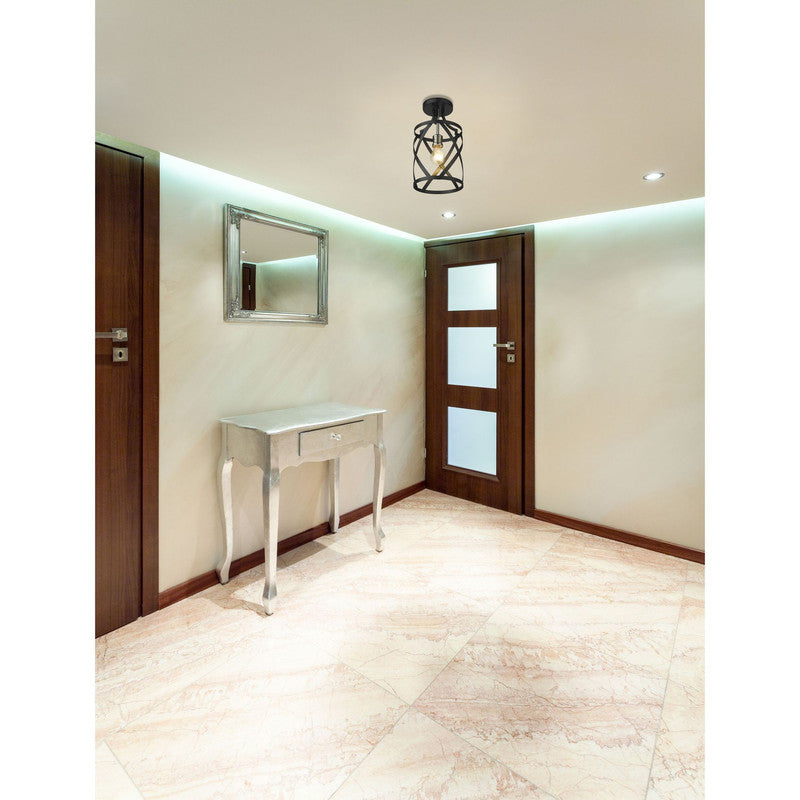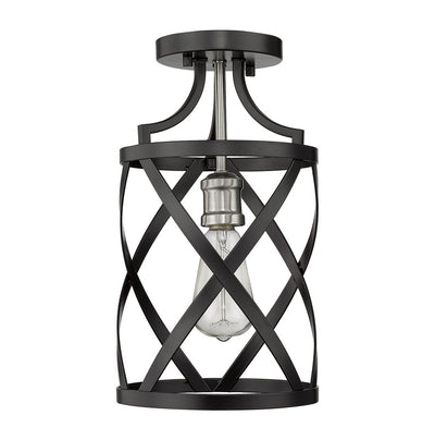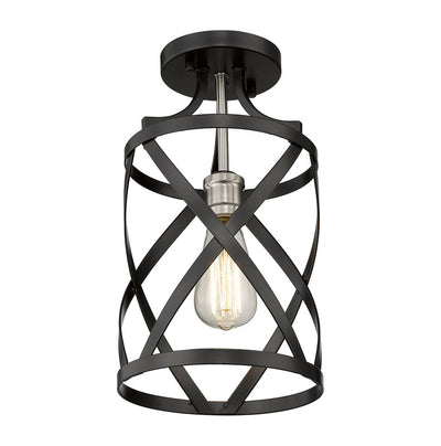 The stylish design of this two-tone one-light flush mount light will dazzle your senses. It features a matte black and brushed nickel finish in a crisp round design highlighted by a series of overlapping X-cross patterns. This light brings a dynamic element to any hallway, foyer, dining room, or living room.