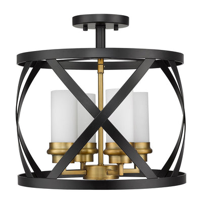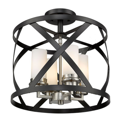 Enhance your home lighting with the stylish charm of this two-tone four-light semi-flush mount light. It features a matte black and brushed nickel finish in an alluring round design highlighted by an X-cross pattern. You will enjoy the immediate upgrade in ambiance this light brings to any hallway, bathroom, dining room, or game room.